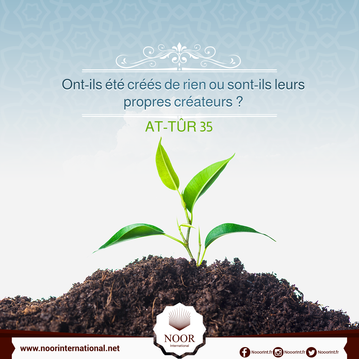 (33) Ou alors diront-ils:《C'est lui qui l'a inventé》. Or ce sont eux qui n'y croient pas. (34) Qu'ils apportent donc un discours qui lui soit semblable, si ce qu'ils disent est vrai. (35) Ont-ils été créés de rien ou sont-ils leurs propres créateurs ?