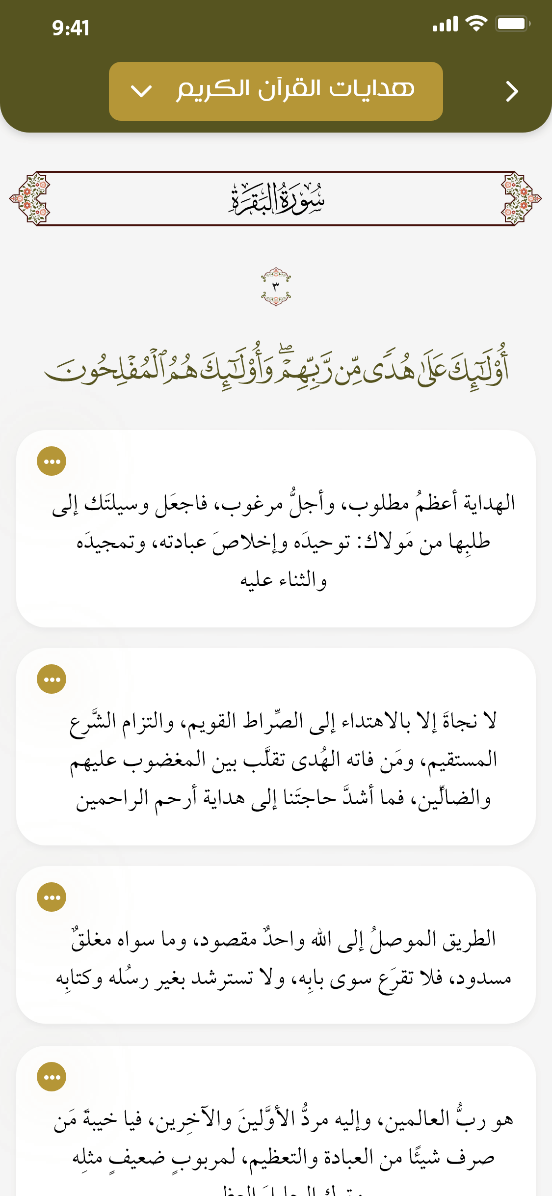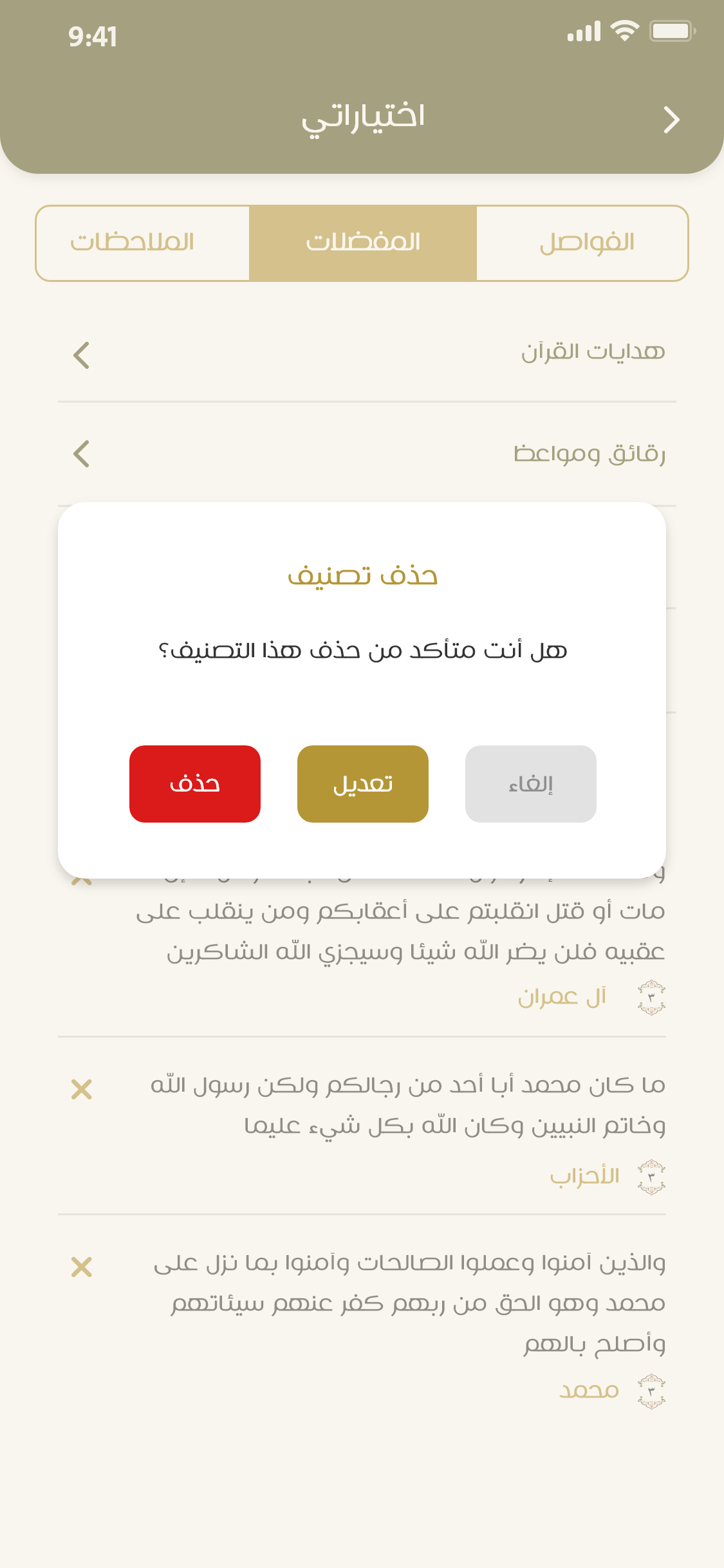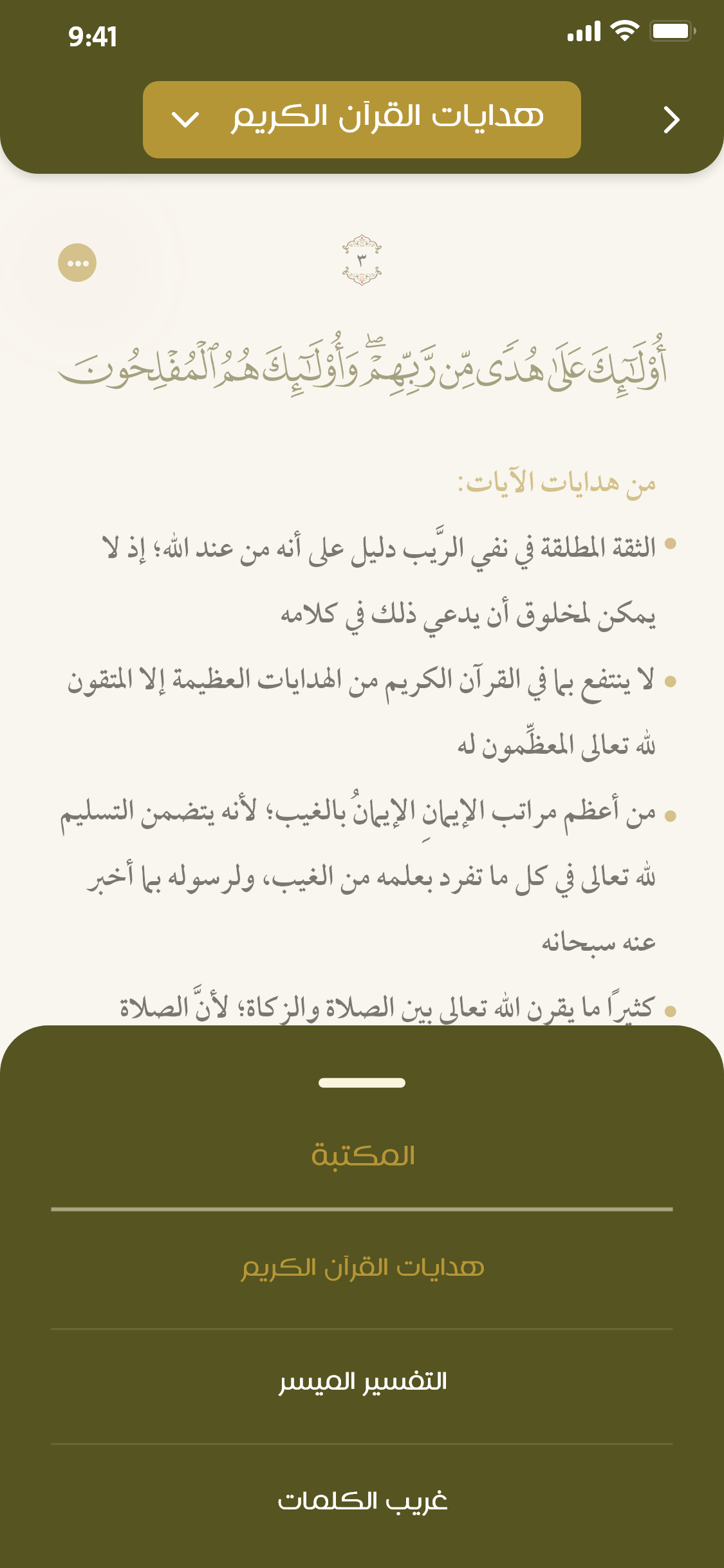 إضافة علامات مرجعية (تفضيل) على الآيات والهدايات؛ للرجوع لها عند الحاجة، مع إمكانية تصنيف العلامات المرجعية حسب الاختيار.