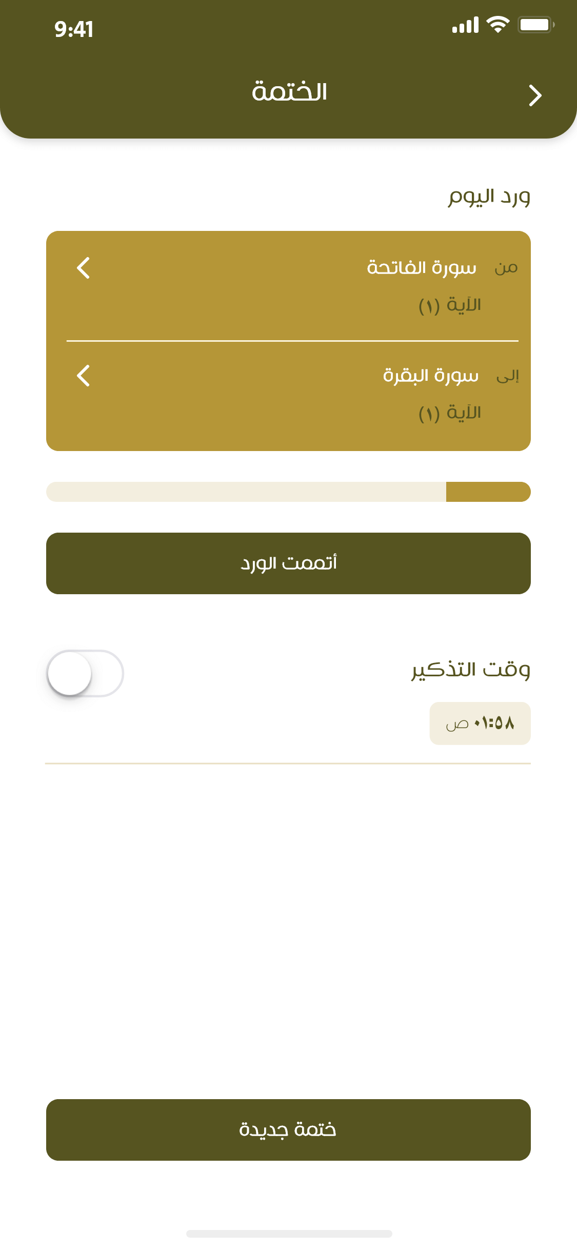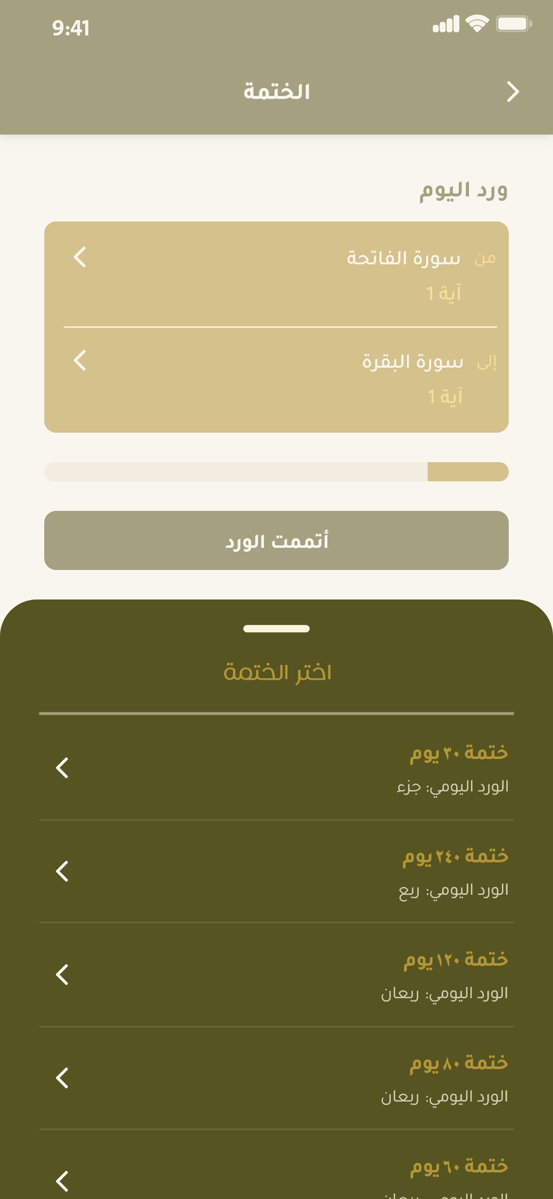 خيارات متعدّدة لختم القرآن الكريم: عدد الختمات، مدة كل ختمة، مقدار الورد اليومي، مع مراعاة ارتباط المعنى عند نهاية كل ورد، والتذكير بالورد. أمثلة للختمات: ختمة مراجعة الحفظ، ختمة تدبرية، ختمة الورد الليلي أو النهاري، وغيرها.